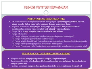 Bank Pelaburan Memberi pinjaman bersindiket kpd syarikat korporat badan berkanun dan institusi kewangan Tidak menerima simpanan dan meminjam kpd org ramai dan firma kecil 5. Sebagai balasannya mereka memberikan jaminan kepada pelabur terhadap nyawa mereka atau beberapa aset tertentu pada waktu memerlukan. Institusi depositori - deposit institusi -taking yang menerima dan menguruskan deposit dan membuat pinjaman termasuk bank-bank membina masyarakat kesatuan kredit syarikat amanah dan pinjaman gadai janji syarikat.